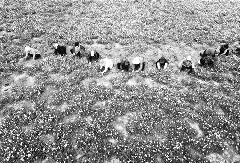 近日,菏泽市单县农户种植的蒲公英进入收割期,当地蒲公英产品加工企业忙着对收购的蒲公英进行加工处理,制作成蒲公英茶、中药材原料等产品投放市场。近年来,该县根据市场需求,采取“村党支部领办合作社”的模式发展蒲公英产业,带动村民就业增收。目前,全县蒲公英种植面积约1万亩。图为4月11日在单县龙王庙镇,村民在蒲公英种植田收割蒲公英。 新华社发