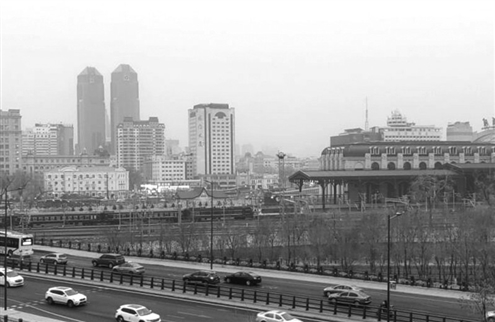 4月10日,哈尔滨市出现大风扬沙天气,天空昏黄,能见度低据中新社