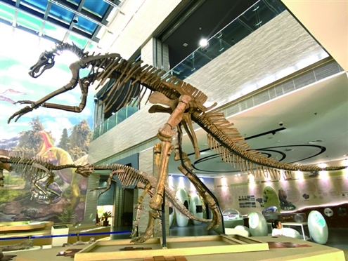 距离棘鼻青岛龙遗址博物馆往南约1公里车程,便是莱阳白垩纪国家地质公园。记者走进园区里的古生物博物馆看到,馆内收藏有众多出土自莱阳的恐龙、恐龙蛋与其它重要的古生物化石。置身馆内,身躯庞大的恐龙骨架,令人久久仰望,残存的恐龙骨头、恐龙蛋,又吸引不少游客俯身仔细观摩。