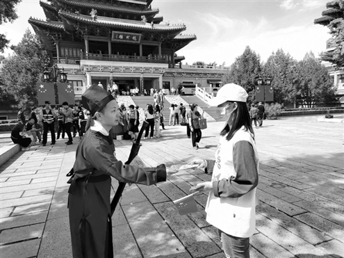 “这位小姐,城池久矣,恐有安危,请移步。”“嘚!这位兄台莫拥挤,否则落入水中去!”“不料小姐竟是从汴京而来。”……中秋国庆假期首日,济南大明湖景区内一位身着古装、口说“古文”的“捕快”边走边看,时刻提醒着往来游客的安全。